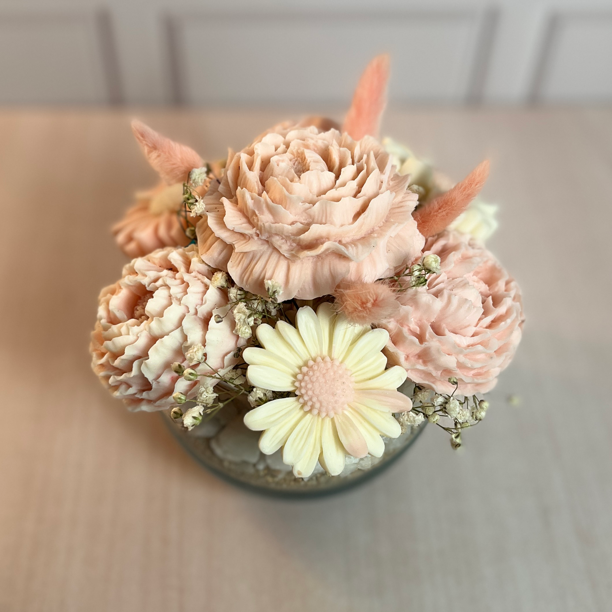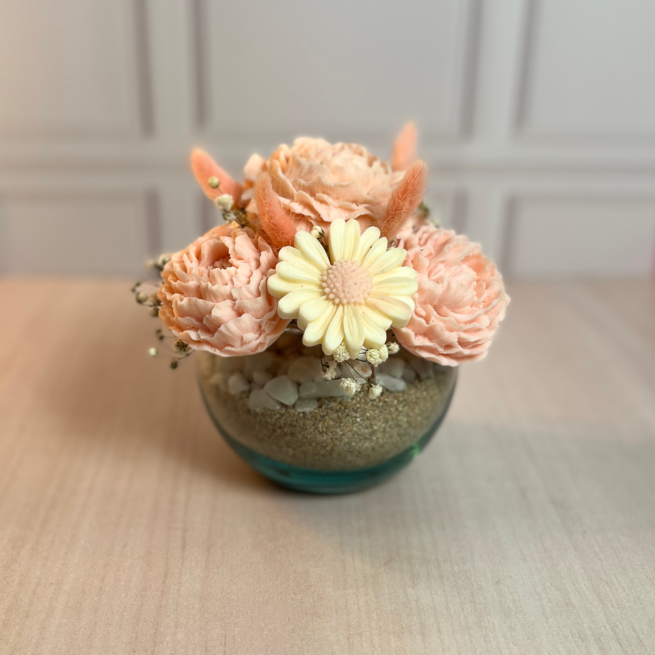 Pecera decorativa con 7 velas florales en tonos rosados es el detalle perfecto para llenar mis espacios de elegancia y calidez. Diseñadas exclusivamente para decoración, estas velas no se pueden encender, lo que asegura su durabilidad y encanto intacto. La pecera, con dimensiones de 16x17x17 cm, está delicadamente rellena con arena y cuarzo, creando un fondo armonioso que realza los tonos rosados de las velas y añade un toque natural y sofisticado. Además, los aromas son personalizables, permitiéndome transformar el ambiente con fragancias que reflejen mi estilo. Es mi forma de decorar con belleza, exclusividad y significado.