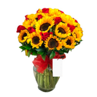 Arreglo con 15 Rosas y 15 Girasoles en Florero Samaritano decorado con cinta