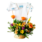 Arreglo Canasta con 7 Tulipanes Variados y Ropa de Bebé