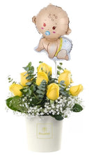Sombrerera Crema Mediana con 10 Rosas Amarillas y Globo Niño
