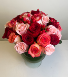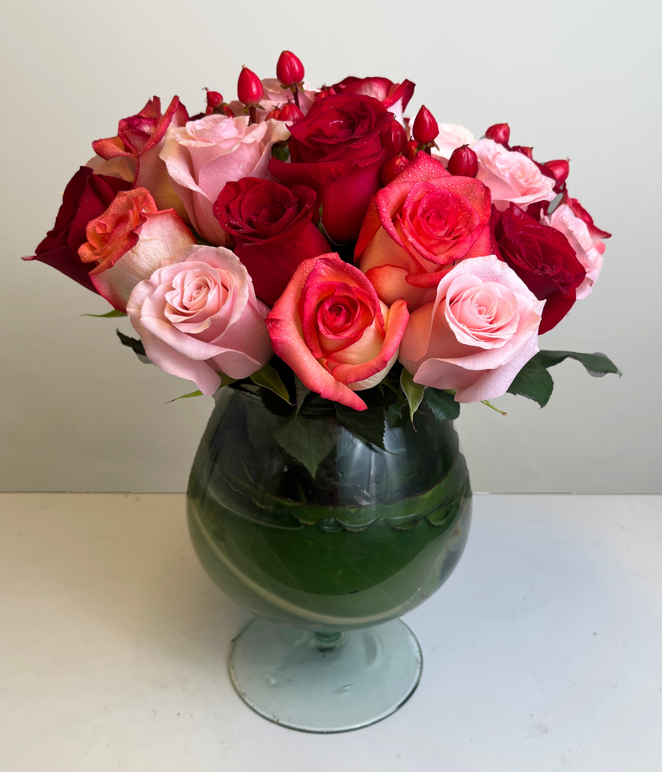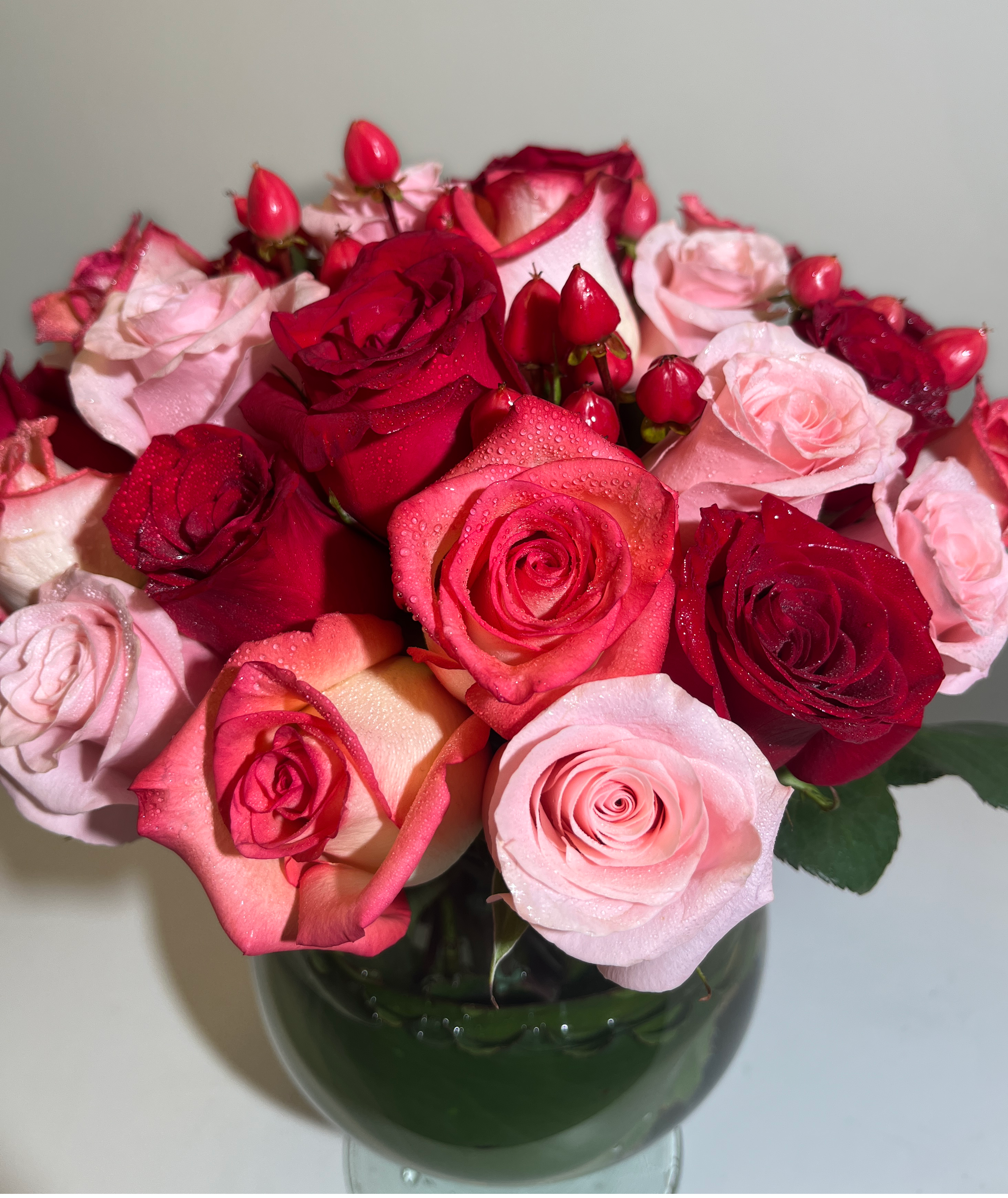 Arreglo con 30 Rosas e Hiperycum en Florero Copón
