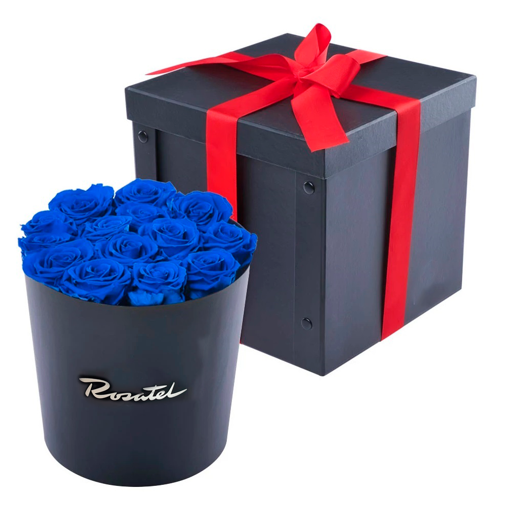 Sombrerera Negra Grande con 14 Rosas Preservadas Azul en Caja Negra