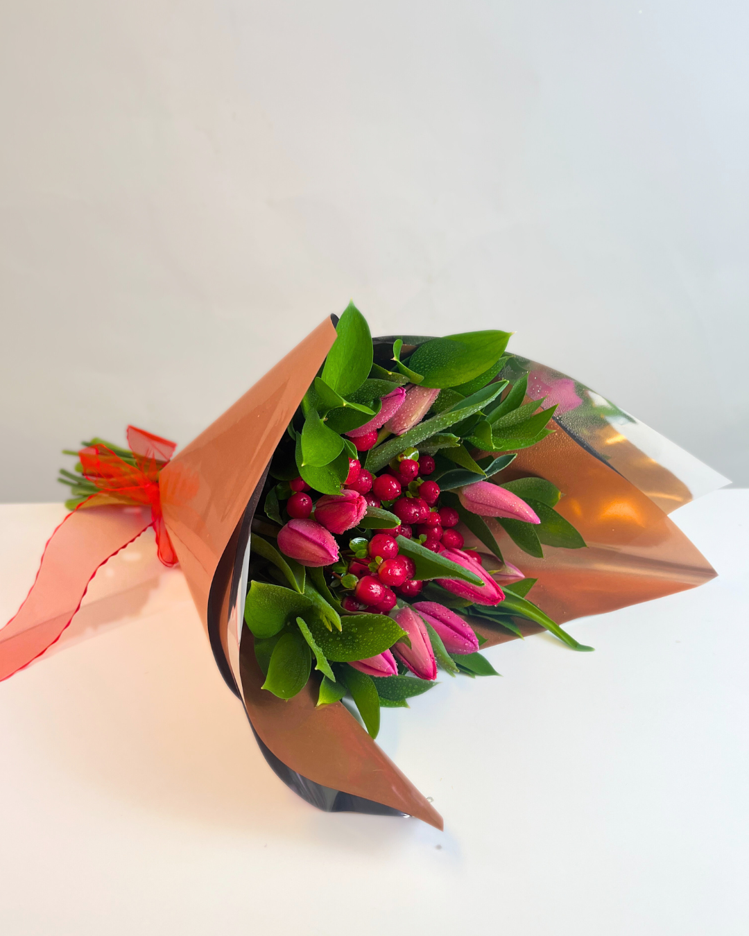 Ramo con 10 tulipanes e Hypericum envuelto en papel metalizado