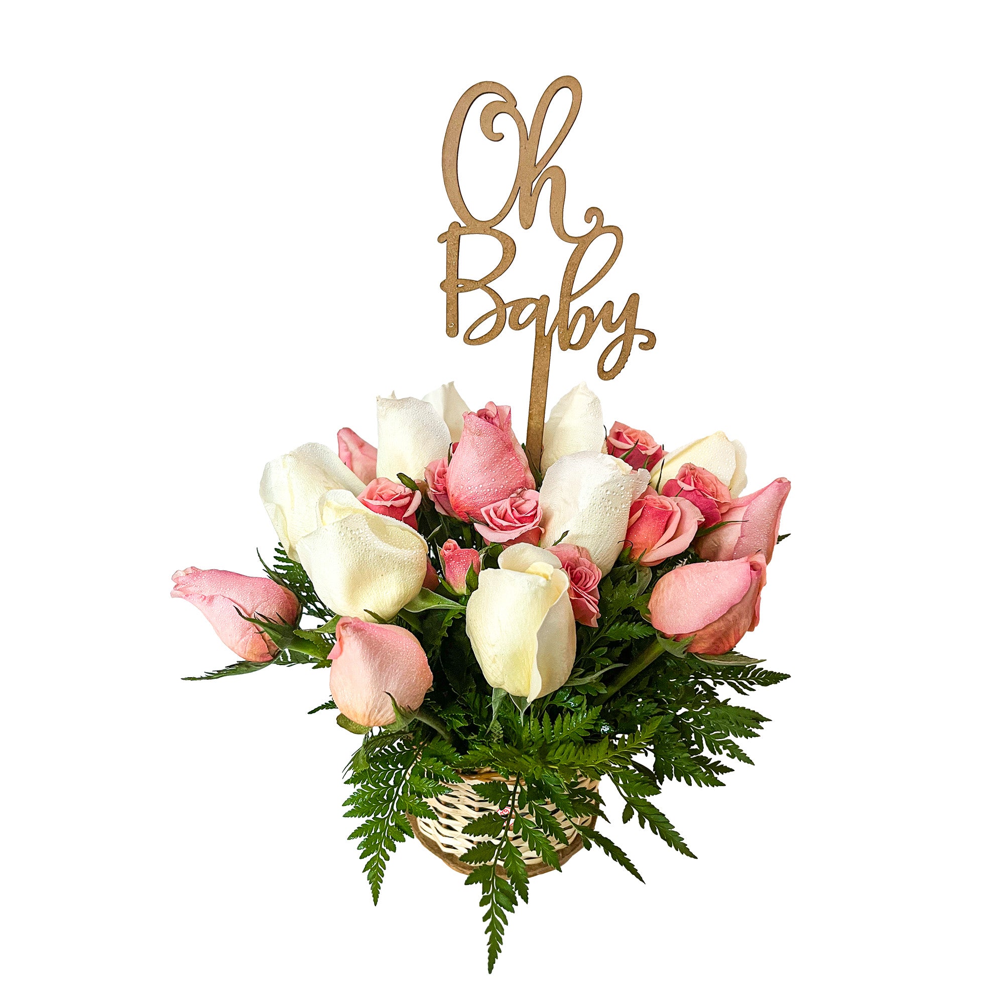 Arreglo Canasta Nido con 15 Rosas (Blancas y Rosadas) Minirosas y Varilla Oh Baby