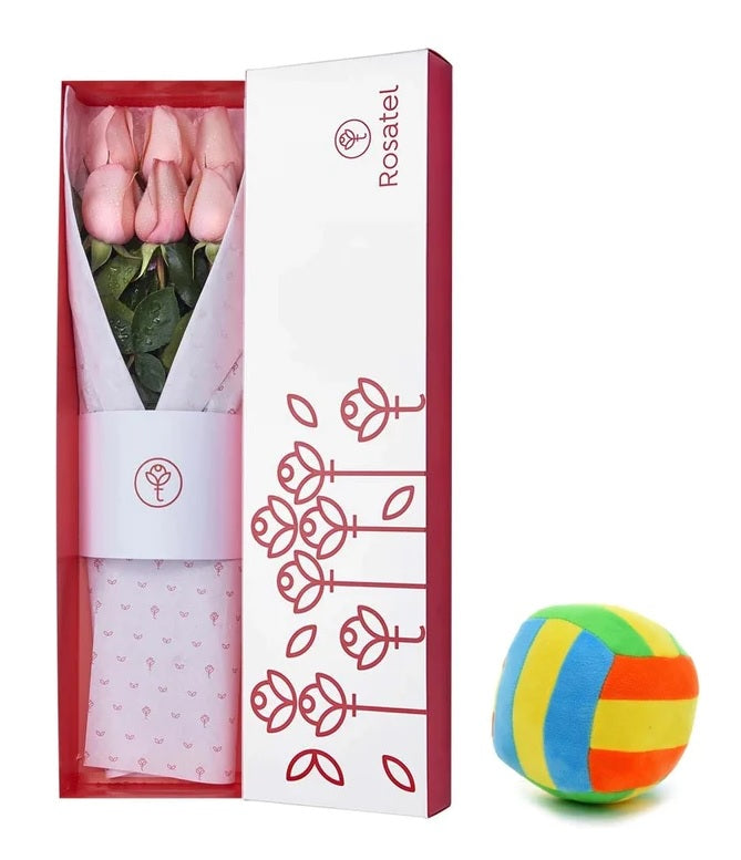 Caja Blanca con 6 Rosas Rosadas y Sonajero Pelota
