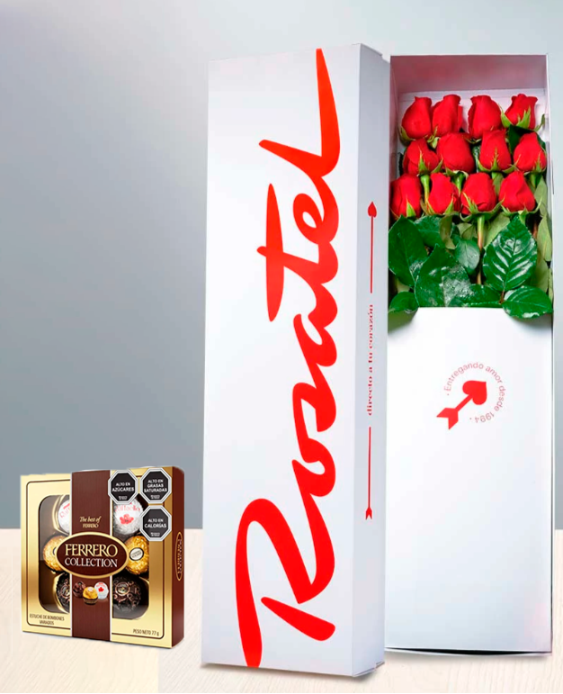 Caja de 12 rosas rojas + chocolate ferrero Collection