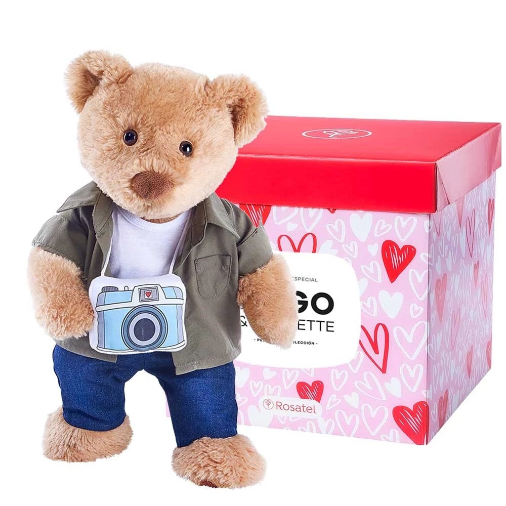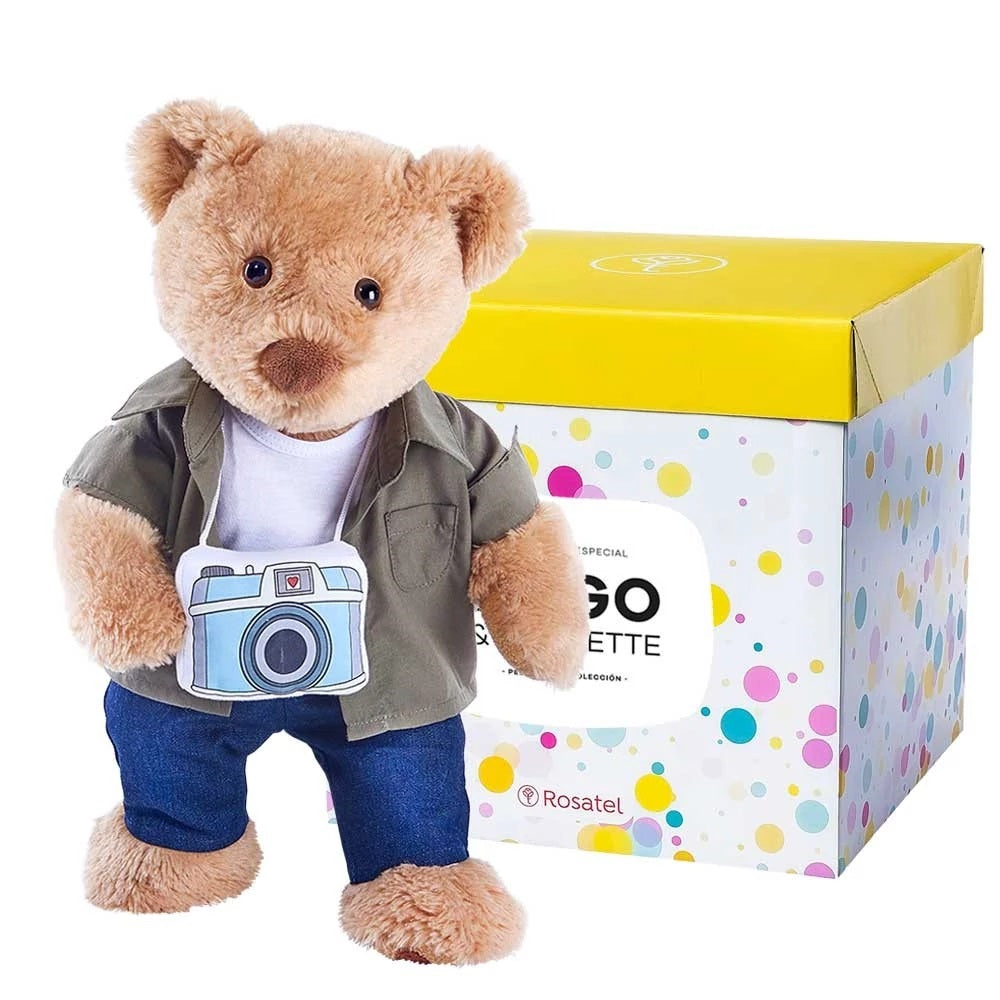 Hugo fotógrafo con pantalón, polo, camisa y cámara fotográfica de tela (45 cms.) en lindo empaque Rosatel.