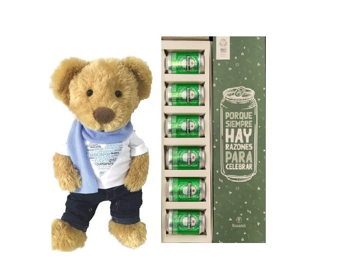 Oso Hugo Súper Papá y Caja con 6 Latas de Cerveza Heineken