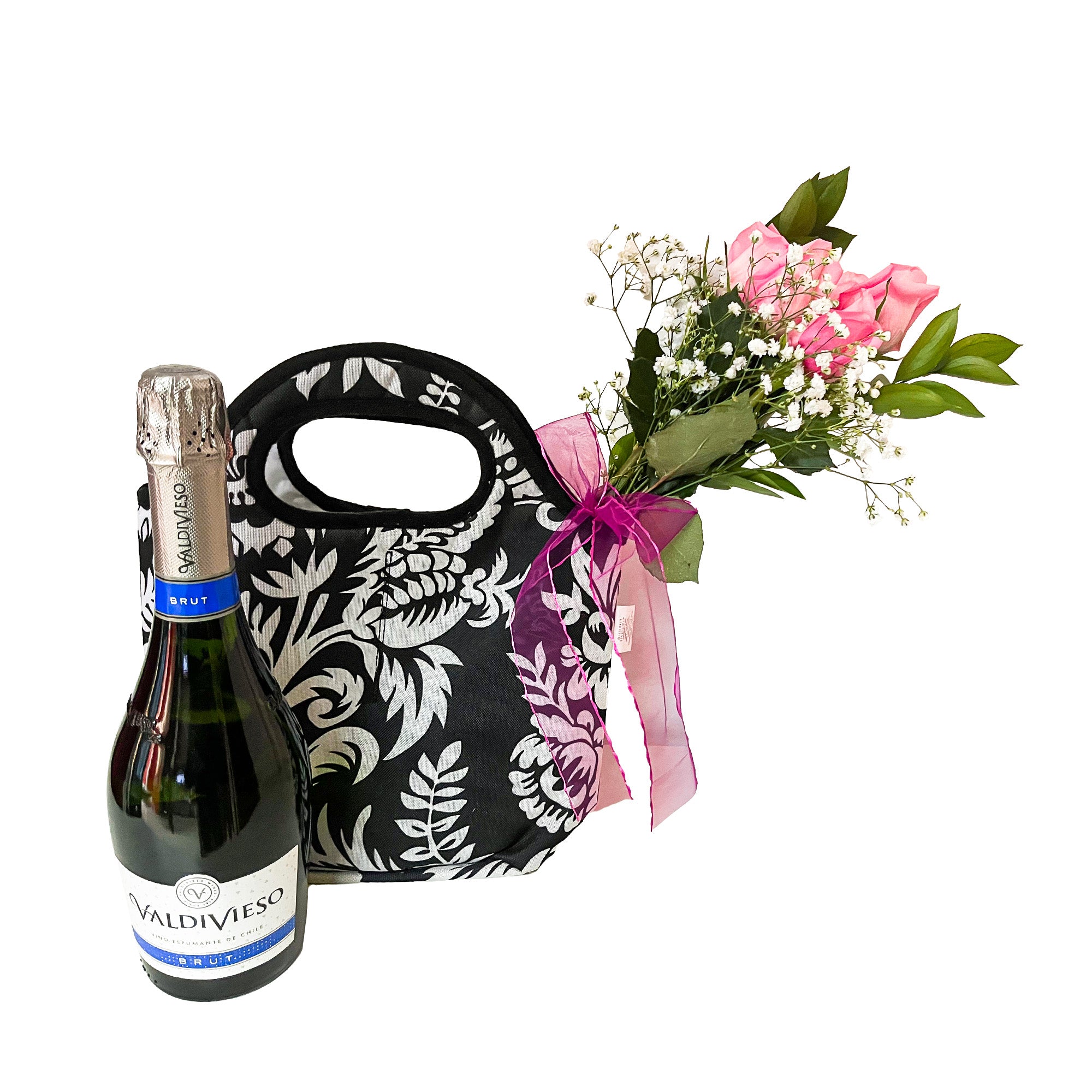Ramo con 5 Rosas Rosadas y Espumante Valdivieso en Bolsa Térmica