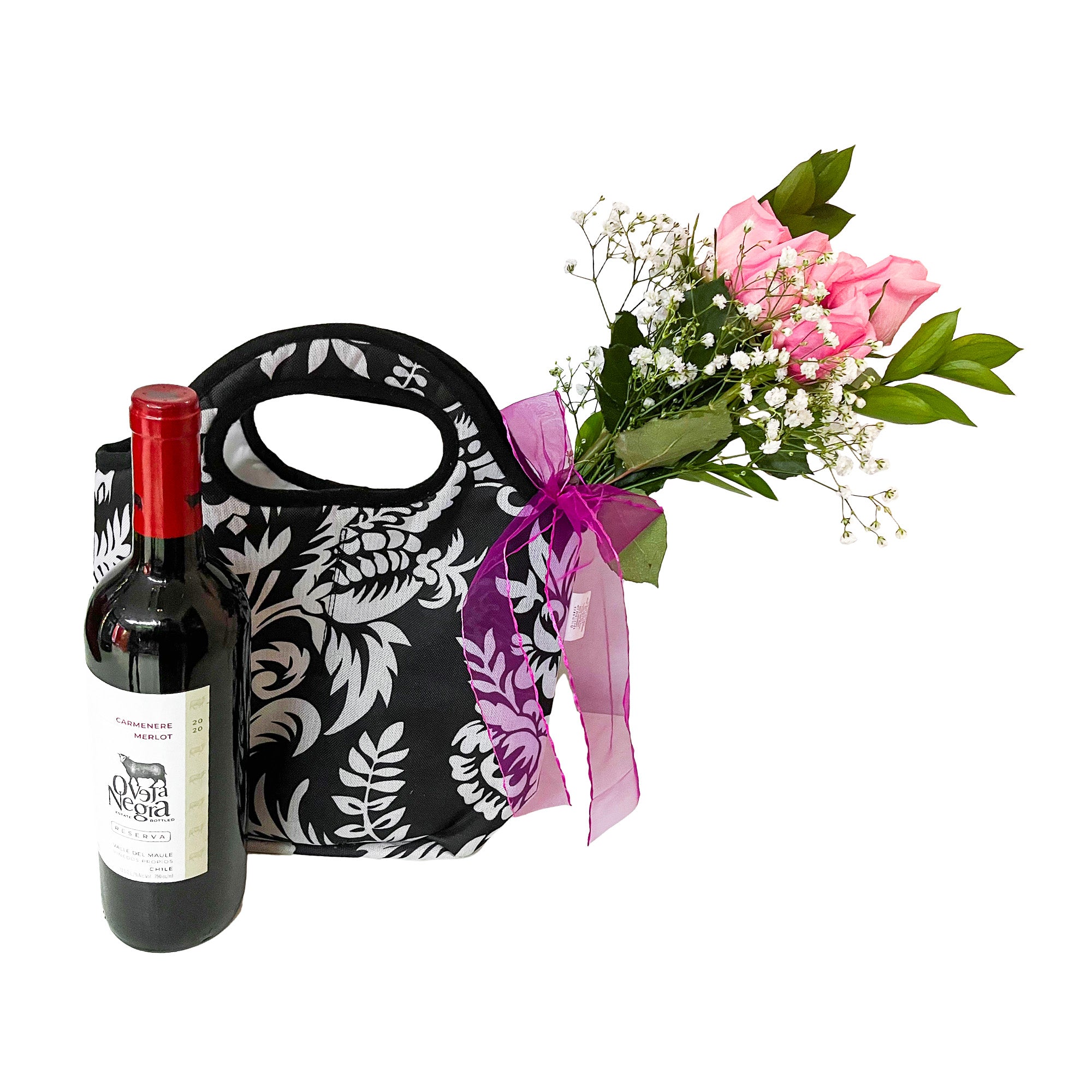 Ramo con 5 Rosas Rosadas y Vino Oveja Negra en Bolsa Térmica