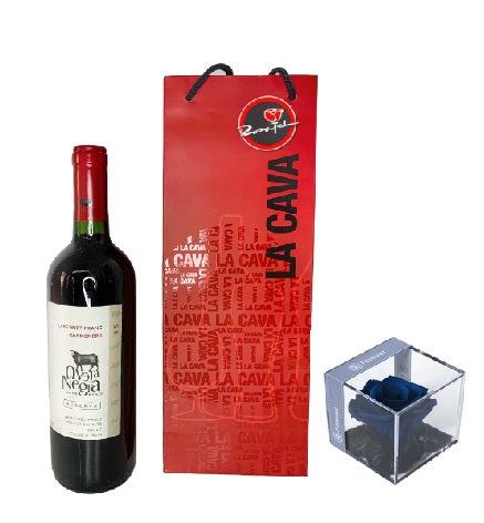 Rosa Preservada Azul en Cubo y Vino Oveja Negra en Bolsa Rosatel