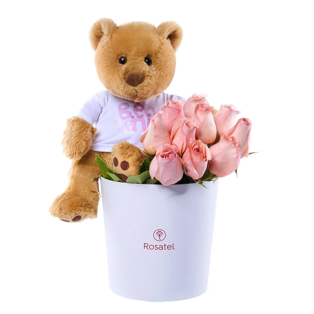 Sombrerera Blanca Grande con 10 Rosas y Peluche Oso Hugo Mediano con polera Bienvenida.