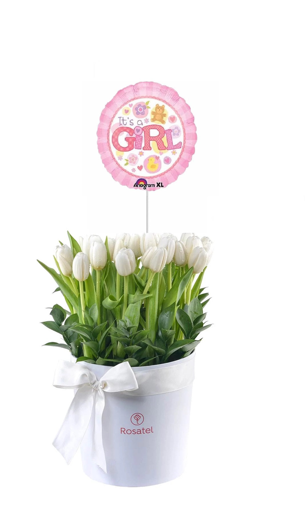 Sombrerera Blanca Grande con 25 Tulipanes, Globo Niña y Cinta