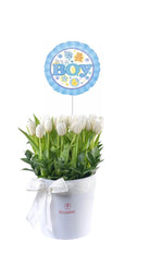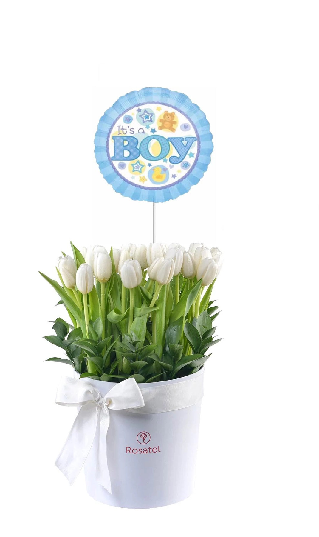 Sombrerera Blanca Grande con 25 Tulipanes, Globo Niño y Cinta