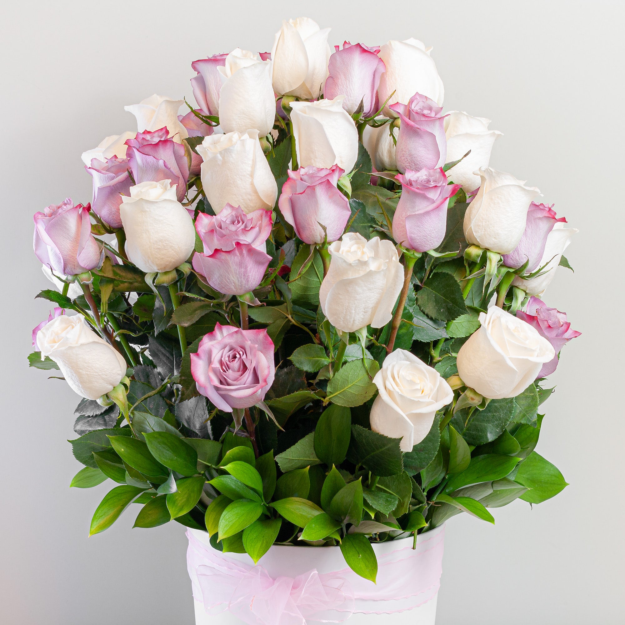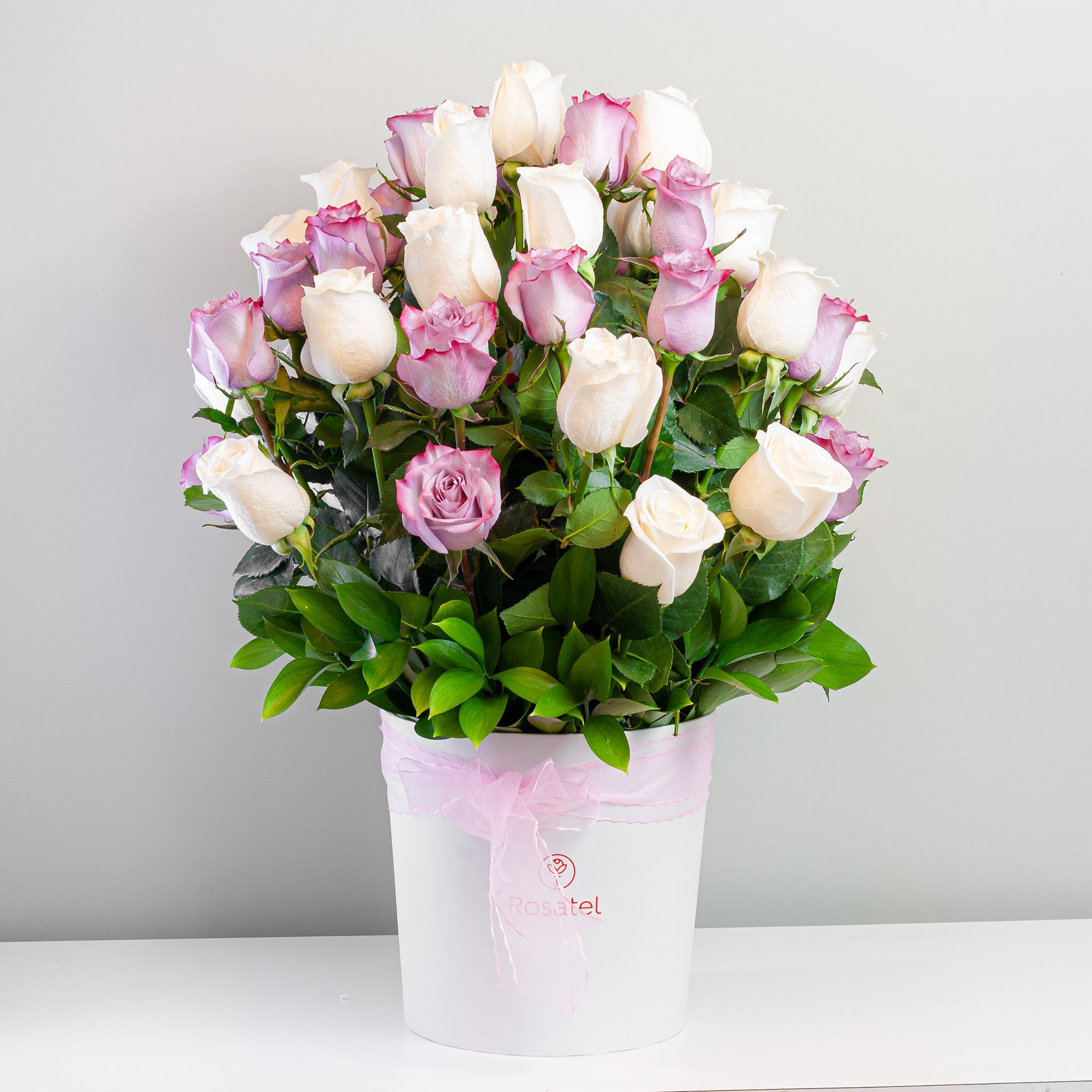 Sombrerera Blanca Grande con 50 Rosas (Lilas y Blancas)