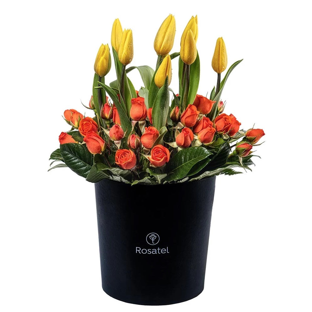Sombrerera Negra Grande con 9 Tulipanes y Mini Rosas Naranjas