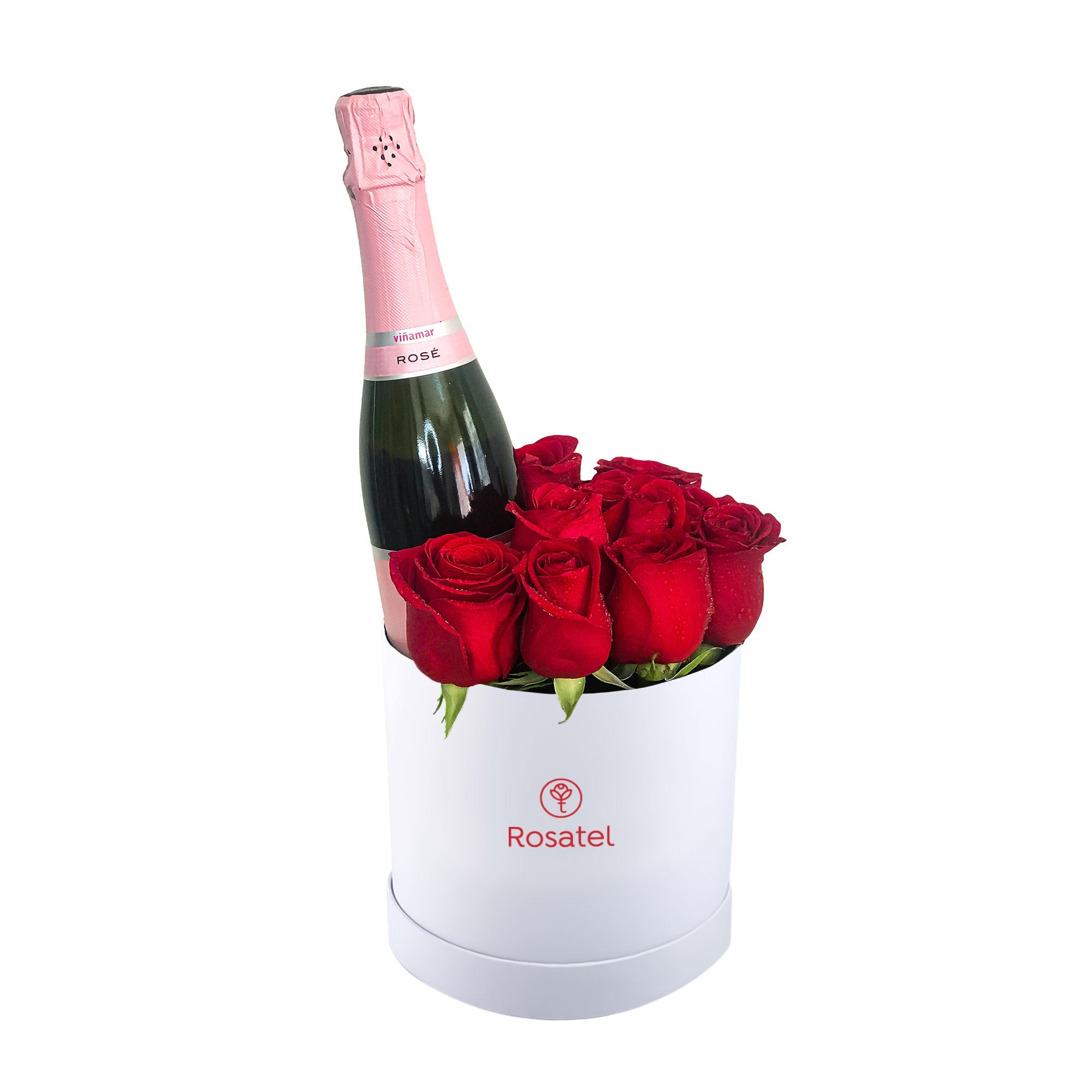 Sombrerera Blanca Mediana con 12 Rosas y Espumante Pequeño Viñamar Rose de 375 ml.