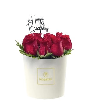 Sombrerera Crema Mediana con 12 Rosas y Tope Happy Birthday