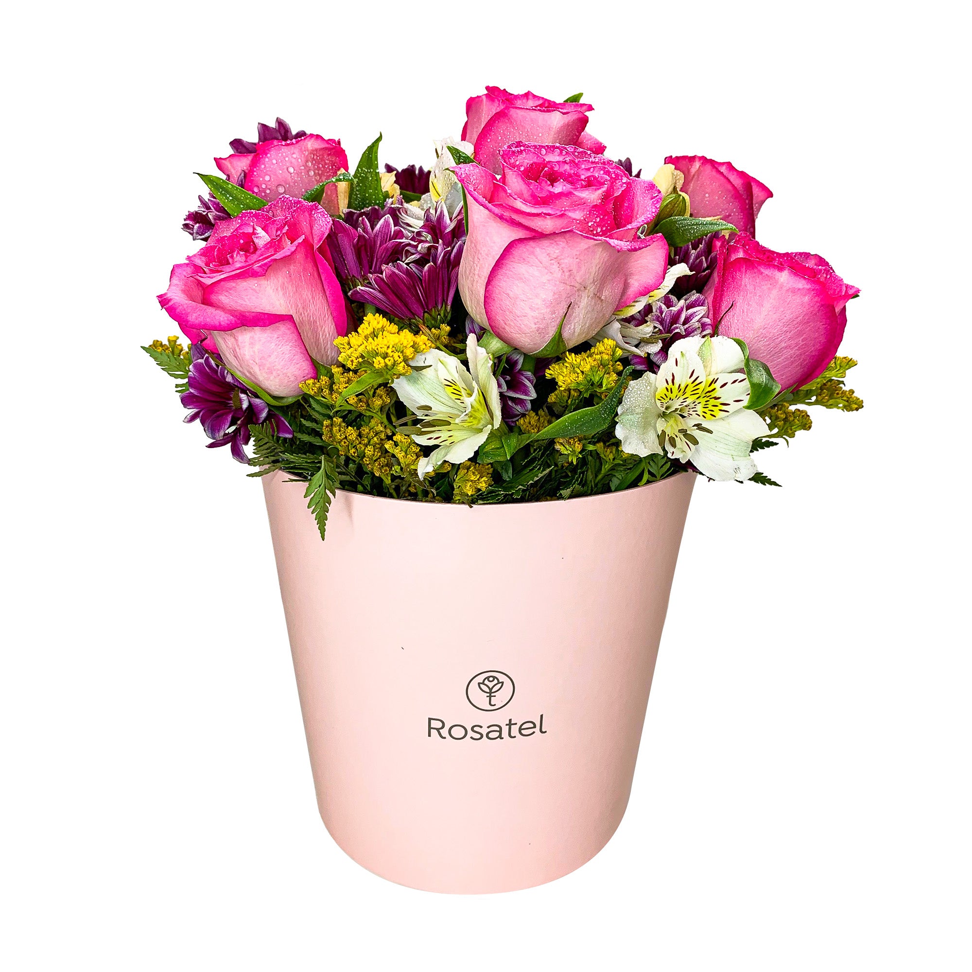 Sombrerera Rosada Grande con 10 Rosas y Flores (Maules, Astromelias, Solidago)