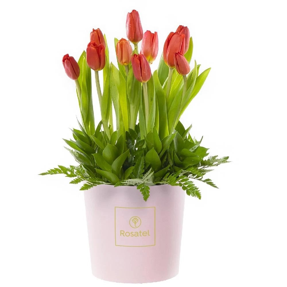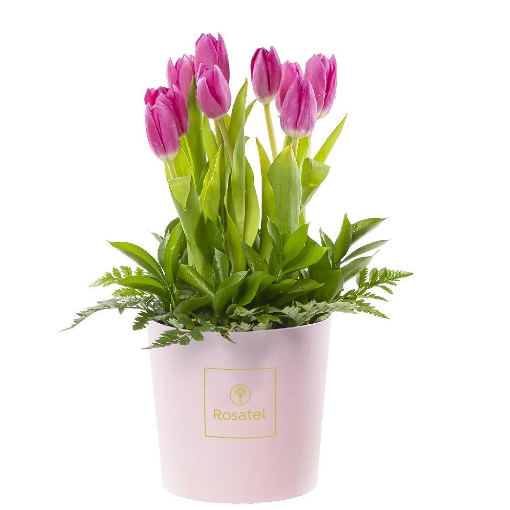 Sombrerera Rosada Mediana con 10 Tulipanes