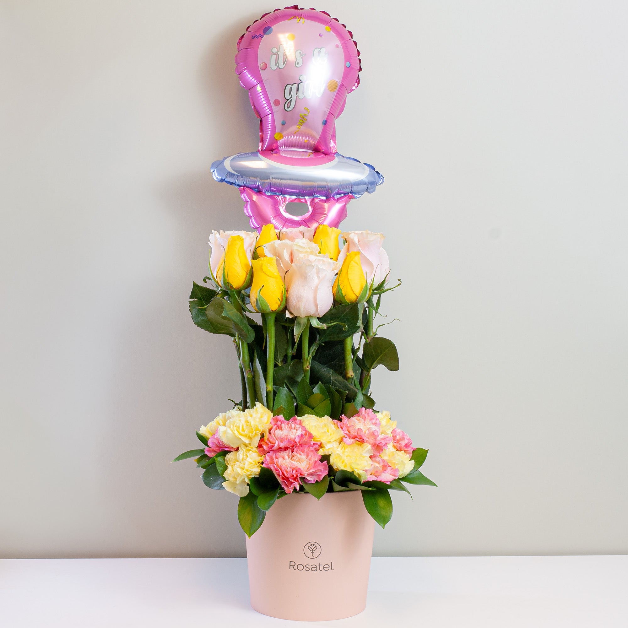 Sombrerera Rosada Mediana con 12 Rosas, Claveles y Globo de Niña de Rosatel: Encarna la esencia de la elegancia y el encanto natural con nuestra exclusiva selección de flores. Este arreglo meticulosamente diseñado combina 12 rosas y claveles en tonos amarillos y rosados, transmitiendo alegría y afecto puro.