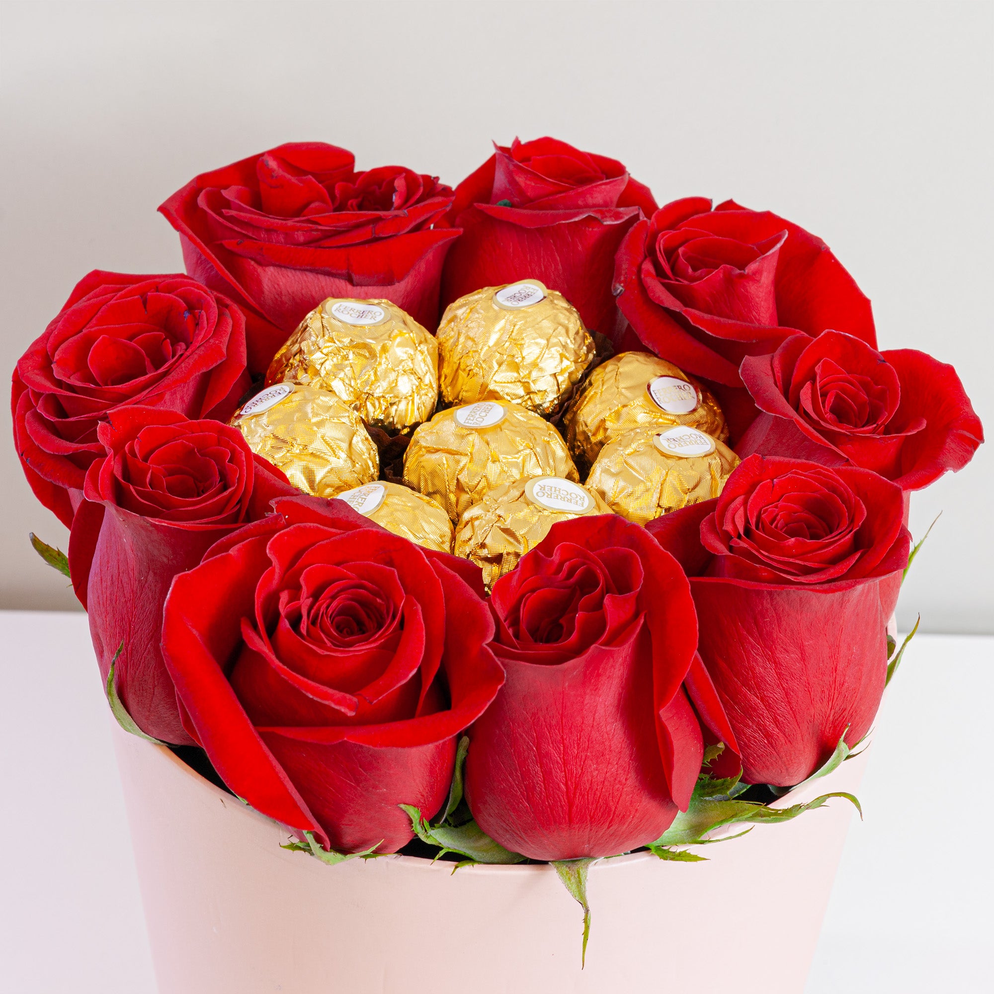Emoción y Conexión: Las rosas, conocidas por su belleza atemporal, junto con los exquisitos bombones, crean una combinación emocionalmente poderosa. Este arreglo no solo deleitará los sentidos, sino que también fortalecerá los lazos afectivos con su encanto y sabor.