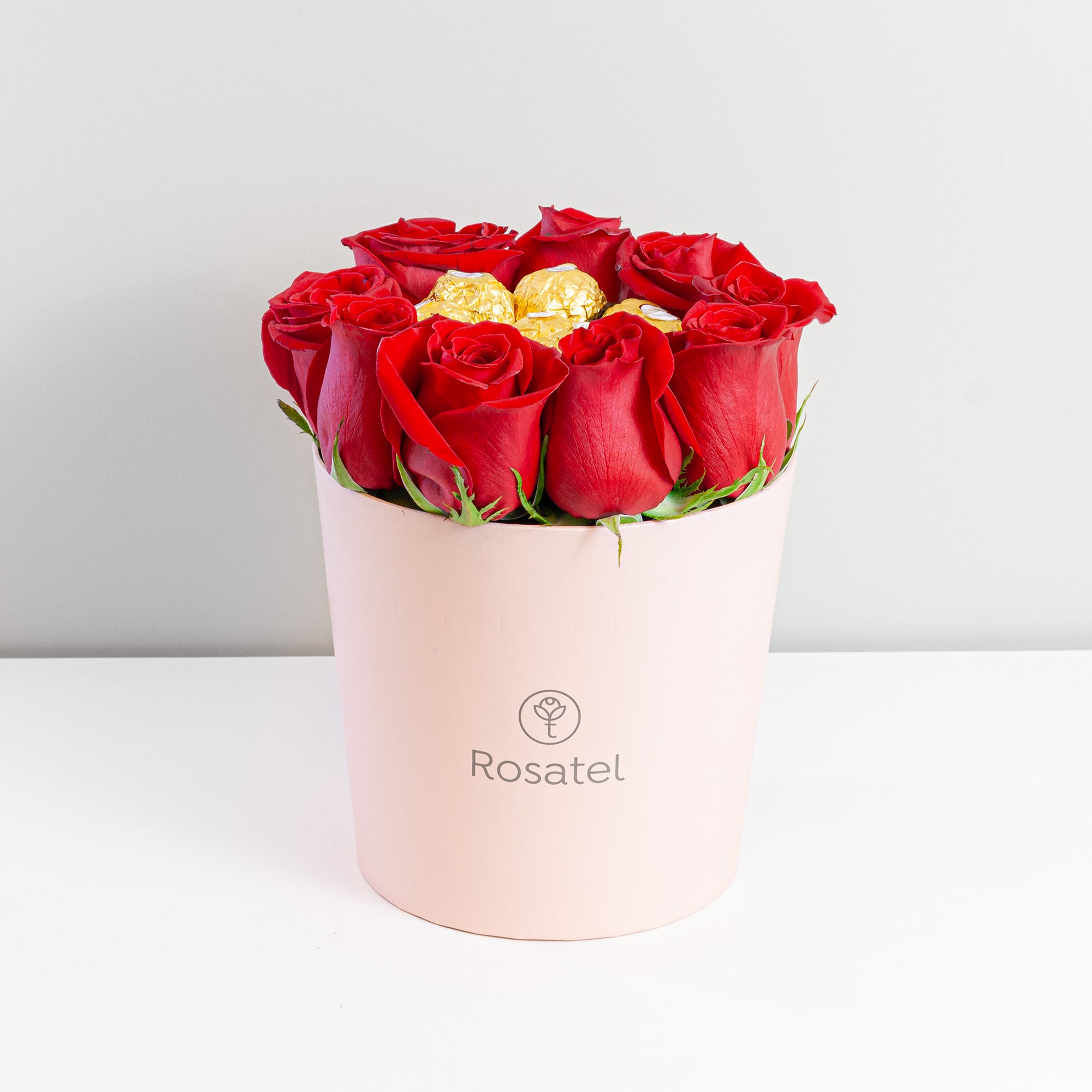 Sombrerera Rosada Mediana con 9 Rosas y Bombones Ferrero