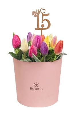 Sombrerera Rosada Mediana con 15 Tulipanes Variados y Topper Mis 15